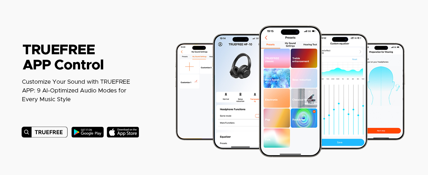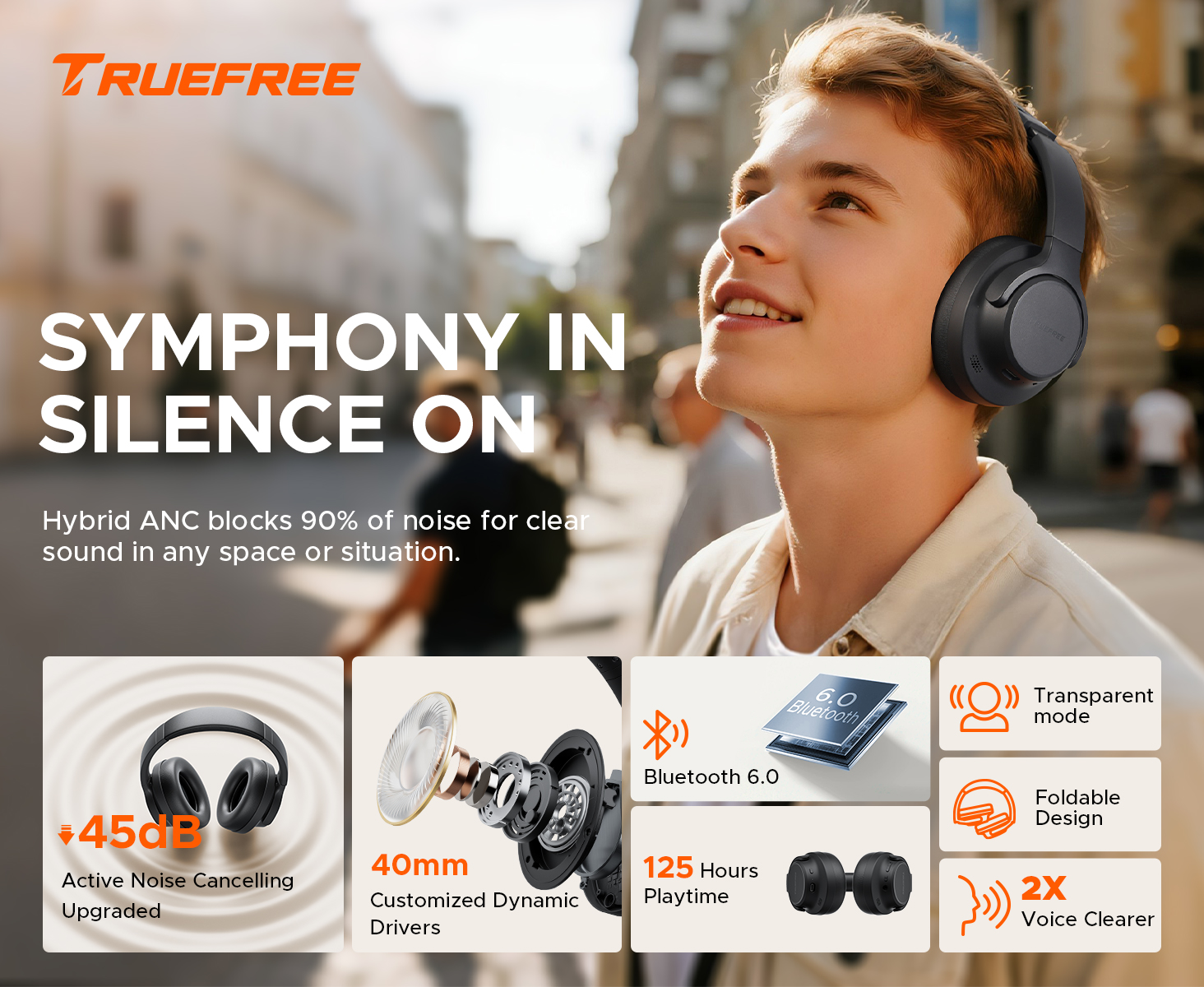 TRUEFREE Over Ear Wireless Headphones, Bluetooth 6.0 Hybrid Active Noise Cancelling Headphones, 125H Playtime, 40mm Driver, Deep Bass, Transparency Mode, Multipoint Connection & App Customize EQ