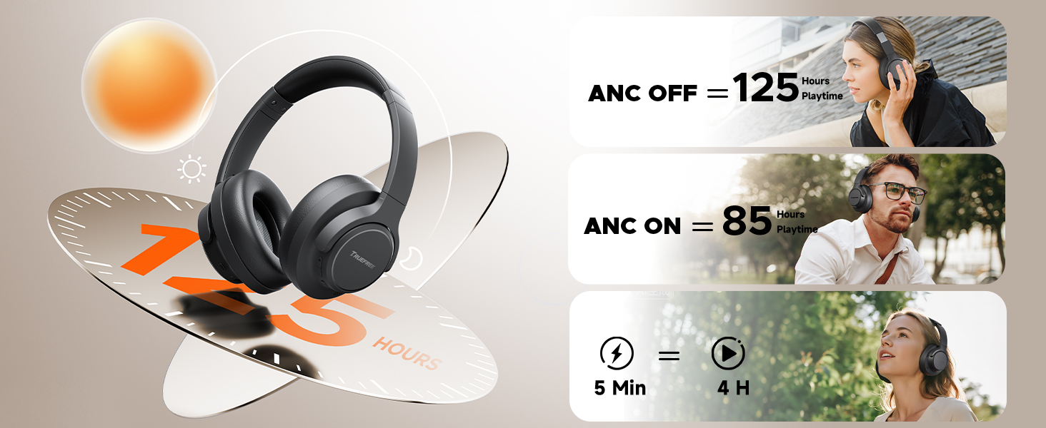 【125-Hour Battery & Fast Type-C Charging】Up to 125 hours of playback time, 85 hours with ANC enabled, and quick charge feature providing 8 hours from 10 minutes charging. You can charge it through the Type-C port, or use a 3.5mm audio cable for a wired connection. Note: If you are not using the over-ear wireless headphones in Bluetooth mode, please turn off ANC to conserve power.