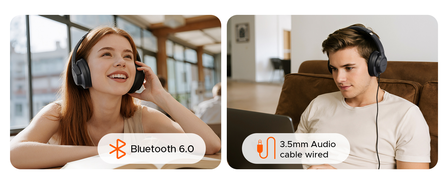 【Latest Bluetooth 6.0 for Seamless Connectivity】Featuring the latest Bluetooth 6.0 technology, these wireless headphones Bluetooth offer faster and more stable pairing with low latency and enhanced signal strength. Seamlessly connect to two devices at once—such as your phone and laptop—and easily switch between calls, music, or videos without re-pairing.